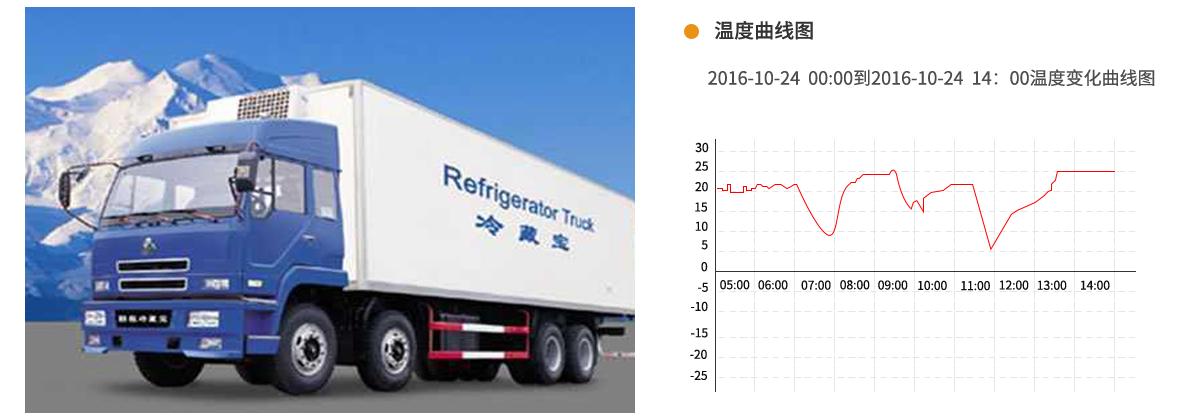 本产品主要用于冷藏车物流运输,或需要对温度进行监控的车辆。可对车内温度进行预警,在食品运输中实现全程监控,超过温度范围时自动报警,对保证食品安全起到非常大的作用。